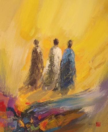 La peinture à l’huile ci-dessus est une œuvre de Chung-Hing (XXIème siècle), intitulée Sur le chemin d’Emmaüs – collection particulière